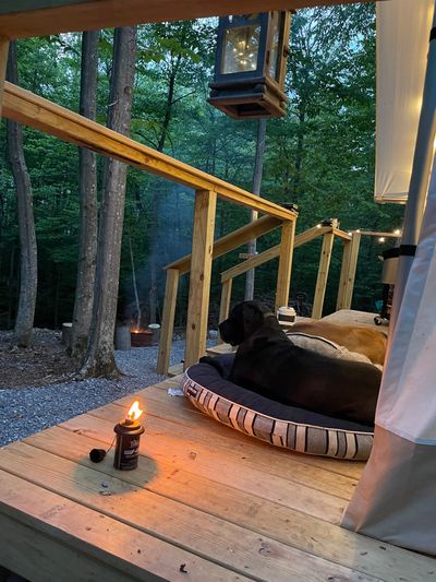 This completely off-grid campsite is high on a ridge overlooking one of our resident babbling brooks, come and while away the hours relaxing in an off grid picturesque natural woodland surrounding. Perched above a custom-built timber deck this campsite layout comprises both a luxury 20' x 16' Canvas Pavilion and an annex for protection from the weather. Adjoining the deck on one side is a custom-built outdoor timer bathhouse enclosure with instant hot water for showering while taking in the wonder of the woods around you. It also has an undercover kitchen with a sink for washing up and grill for cooking up your barbie treats! Built with the beauty of the natural private surroundings in mind it has a clear roof and windowpanes to take in the forest views.